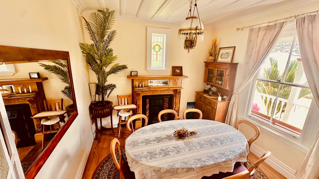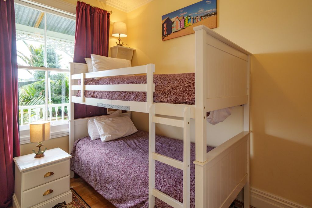 There is only one-bedroom downstairs, and it’s the BUNK ROOM. Our more mature guests often prefer this room because of its proximity to the kitchen (cups of tea and snacks during the night!), the lounge, front deck, and the two downstairs bathrooms (a night time tinkle or two!) AND they don’t have to climb the 140 year old stair case to go to bed! The mattresses are both king singles in this bunk