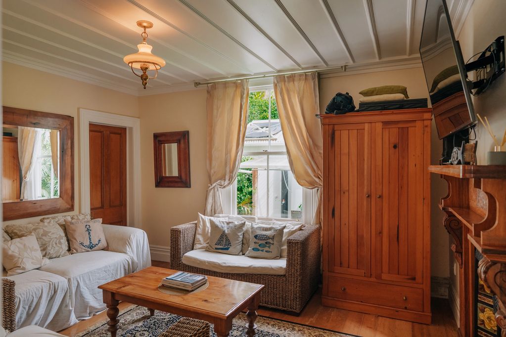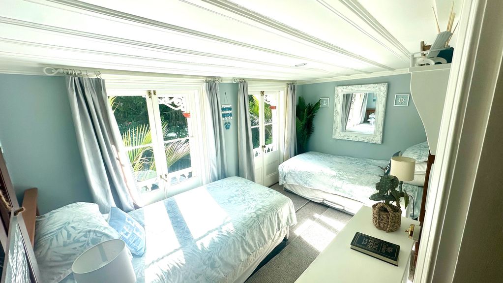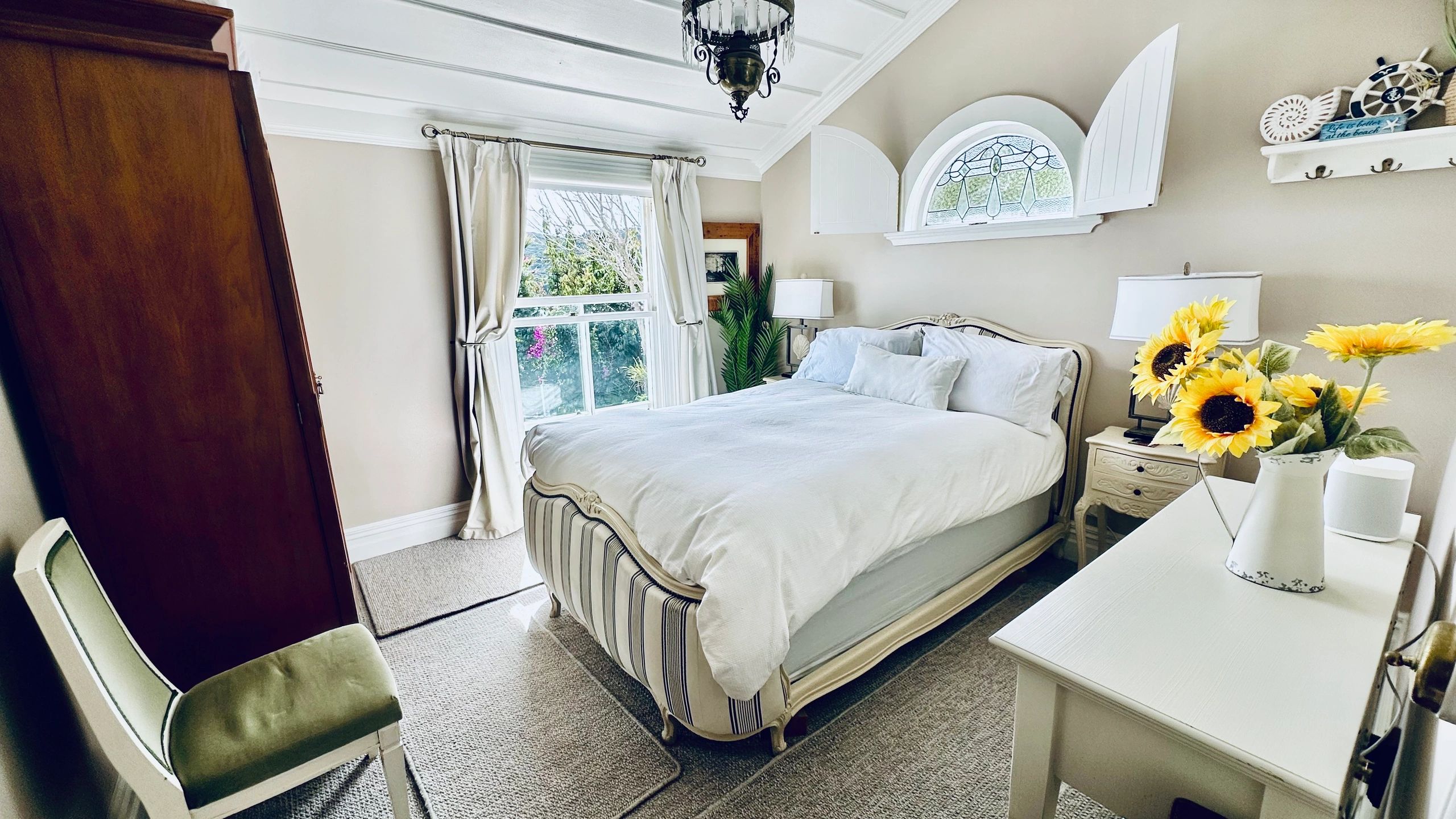 The upper storey BROWN ROOM is tasteful and cosy, also with multimillion-dollar water views. Enjoy the French antique bed with a brand-new mattress, the mid 18th century ceiling light, and the period Kauri wardrobe. Lie in bed and watch the boats go by, or the gannets diving for their dinner, or the stars twinkling in the clear night sky. Either way, you’ll love lying in bed and you won’t want to leave your room!
