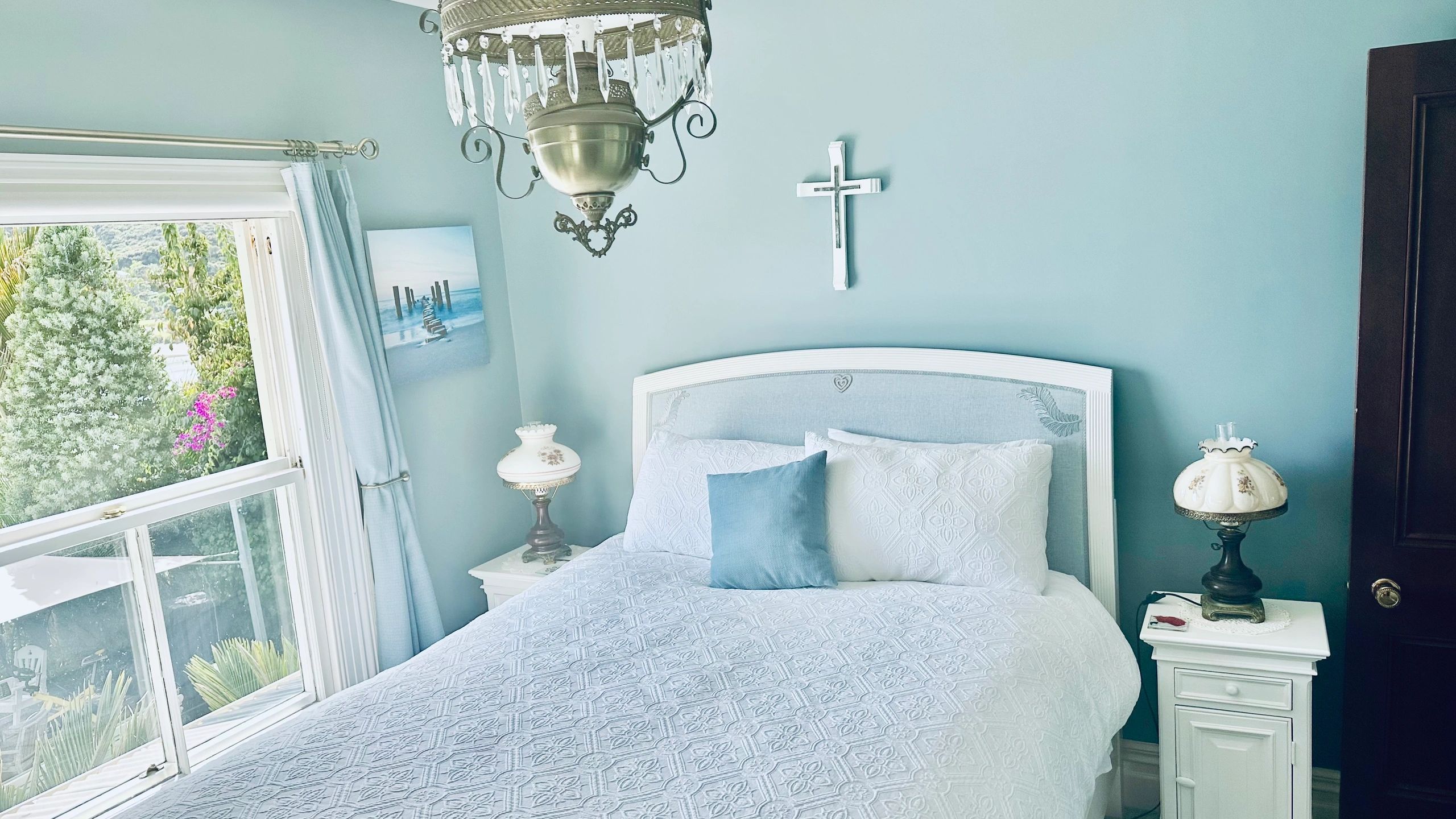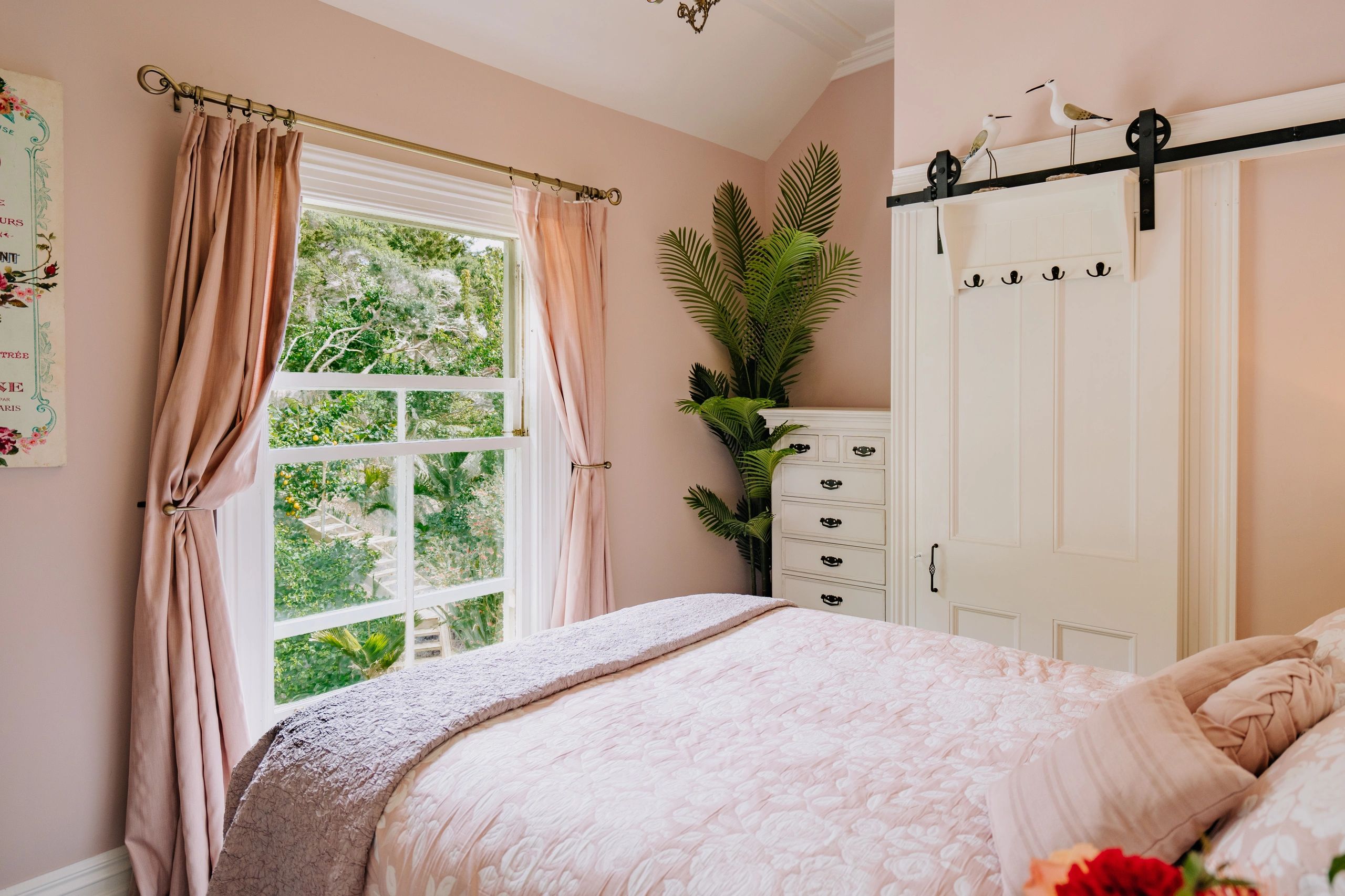 The beautifully decorated PINK ROOM oozes peace and tranquility. It is the 3rd of four upper storey rooms at Oke Bay Lodge. From your Queen size bed you’ll look out to the newly established orchard, flower beds, and native trees. The orchard is truly alive with birds of all kinds, bees, and insects! There is also a high-quality cot in this room, should you be coming with a toddler. The mattress on the bed is superb!