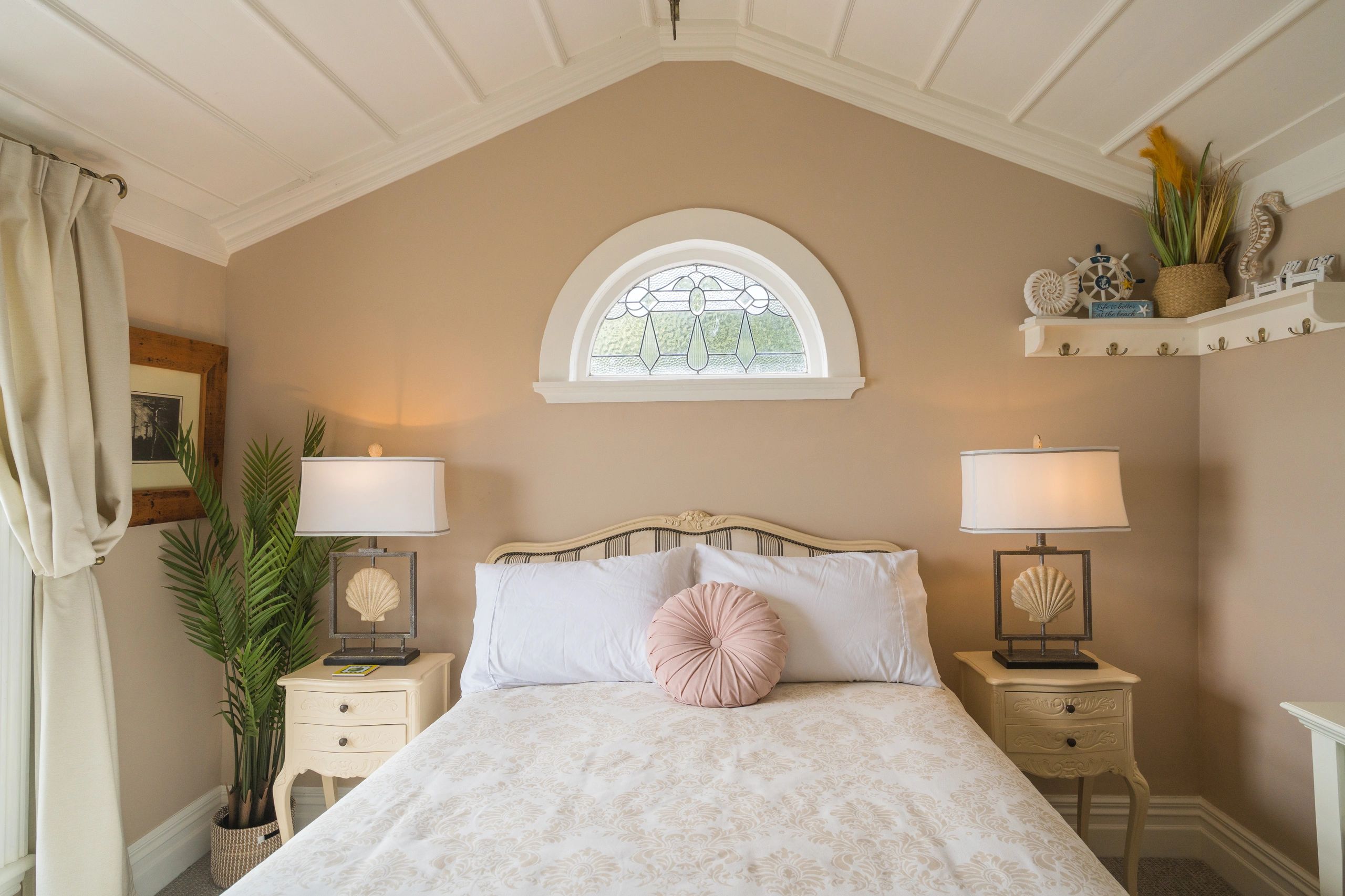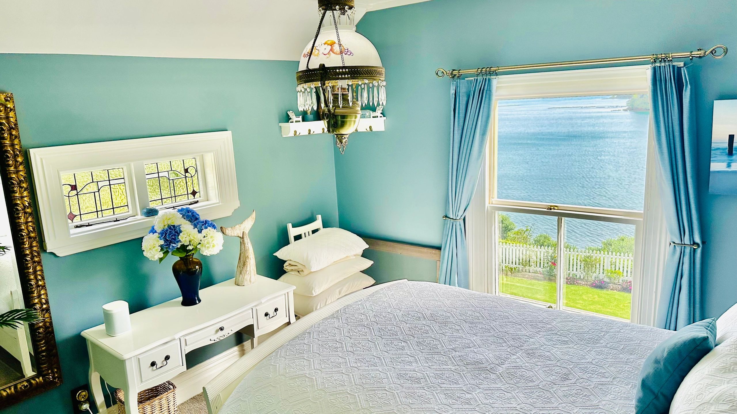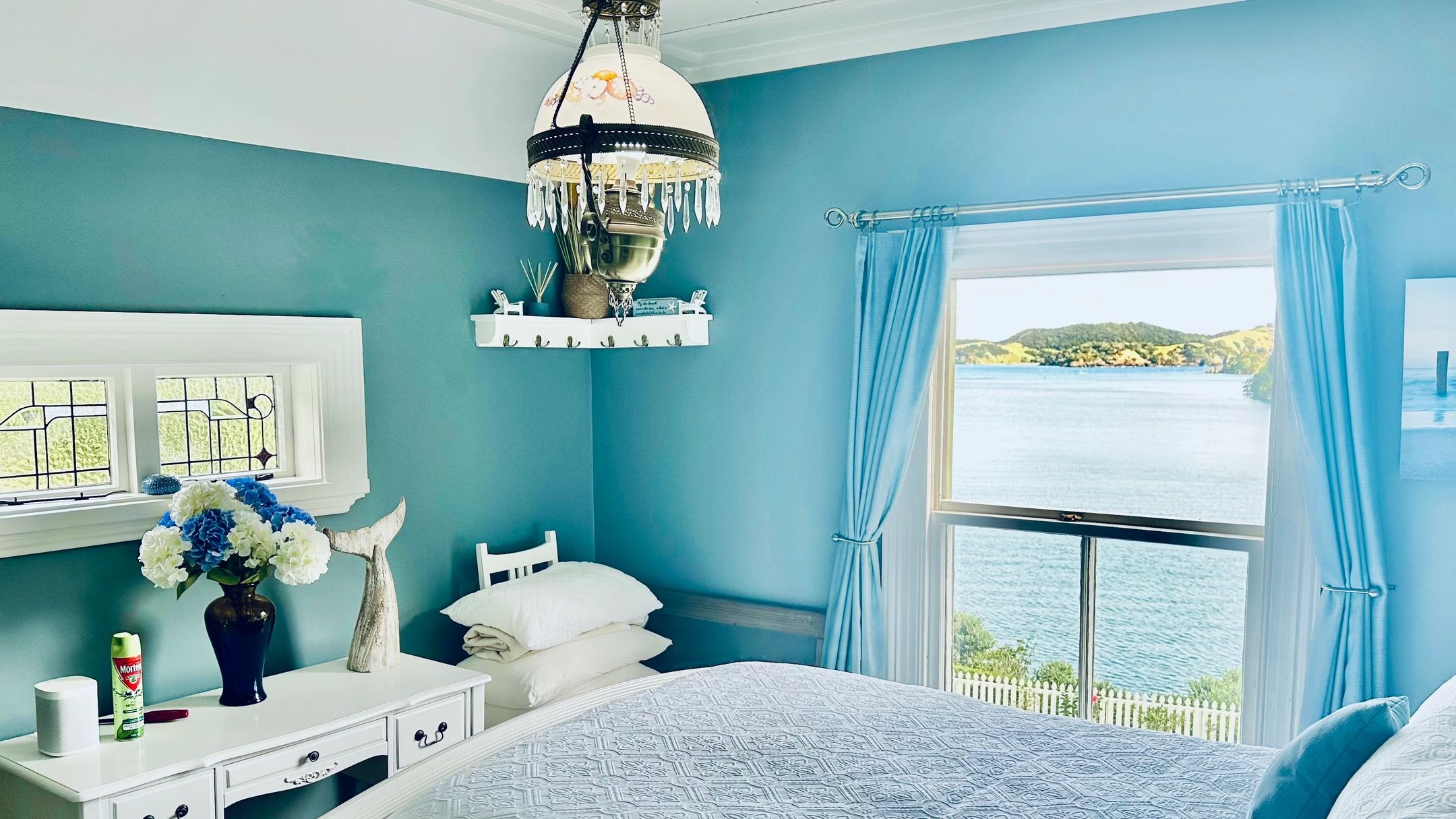 This is our romantic and gorgeous BLUE ROOM which is situated on the second storey of the Lodge. Being absolute waterfront, you’ll love the multimillion dollars views from the window looking out to the entrance to the Bay Of Islands. Impeccably restored, this room has it all – stunning art, a large dress mirror, antique fittings, a set of drawers, and a top-quality bed. Everything is set for you to arrive and enjoy!