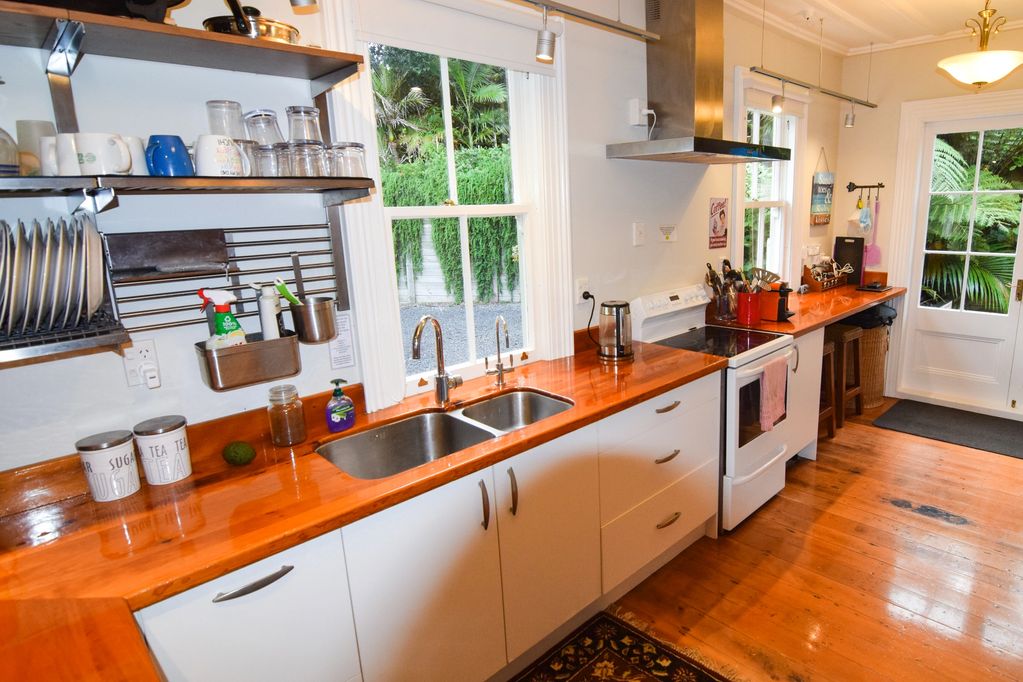 THE KITCHEN is exquisite! The native NZ timber bench tops, finished with high gloss apoxy resin, ooze character and charm. With two large fridges on hand, a wine rack, and a generous pantry, you’ll have everything you need to store your holiday supplies! Every conceivable piece of kitchen hardware is on hand in this kitchen from baking equipment / tools / utensils/ sharp knives, to electronic gism